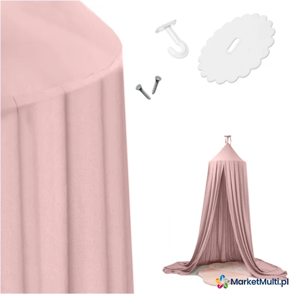 Różowy baldachim to piękna ozdoba pokoju. Delikatny kolor i zwiewna tkanina dodadzą wnętrzu uroku i przytulności. Kurtyna doskonale wkomponuje się w każdą aranżację, niezależnie od stylu, w jakim urządzony jest pokój. W zestawie znajdują się niezbędne elementy potrzebne do zamocowania baldachimu.
