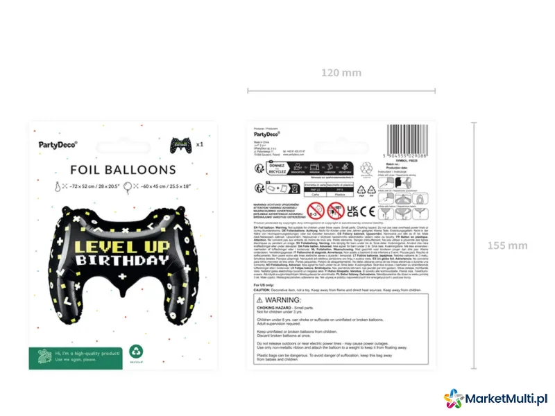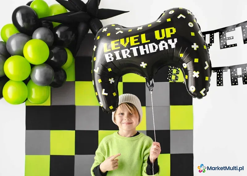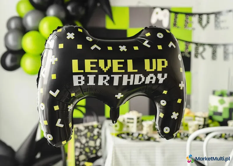 Balon foliowy Gamepad w kolorze czarnym z kolorowym nadrukiem i napisem ''Level up Birthday'', wymiary przed napompowaniem ok. 72 x 52 cm (28 x 20.5''), wymiary po napompowaniu ok. 60 x 45 cm (25.5 x 18''). Do napompowania powietrzem i helem. Zestaw zawiera słomkę.