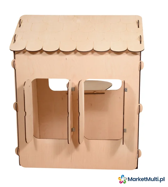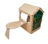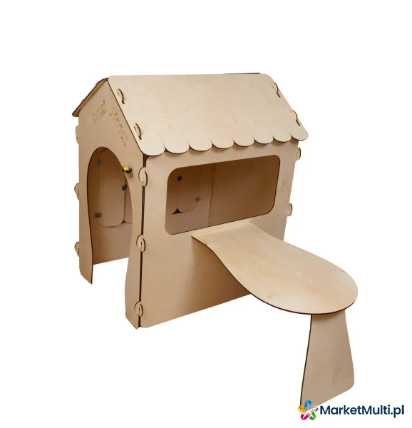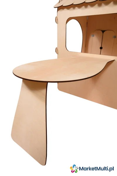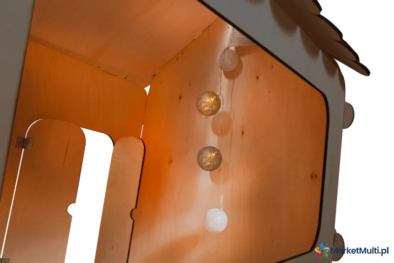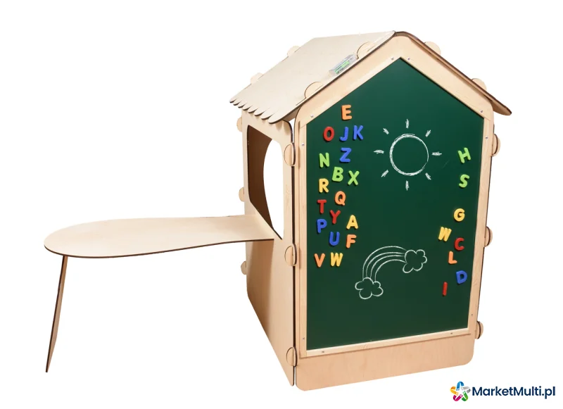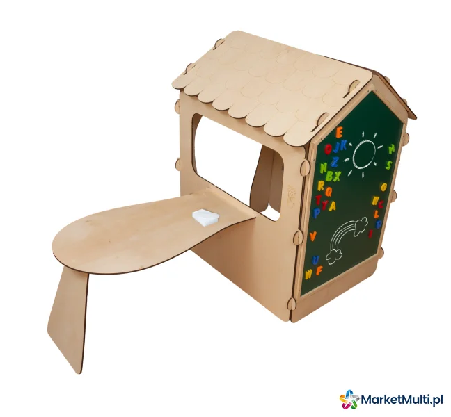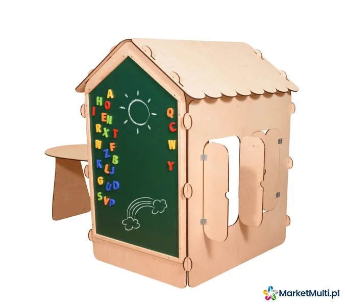 DOMEK DREWNIANY DLA DZIECI Z TABLICĄ KREDOWĄ I STOLIKIEM KULE LED 86 X 137 X 105 CM