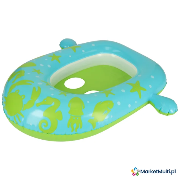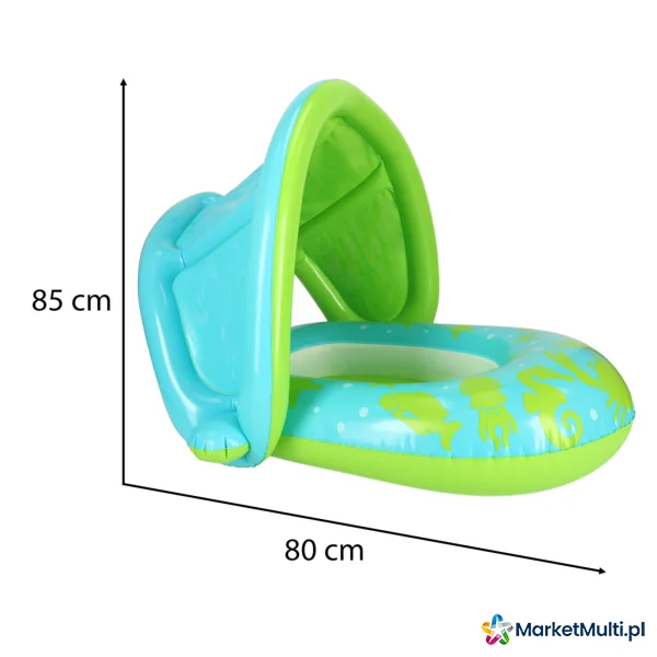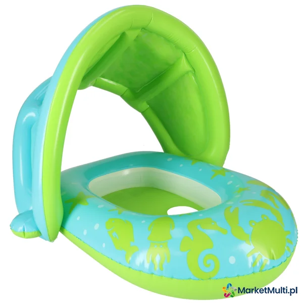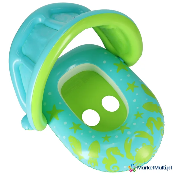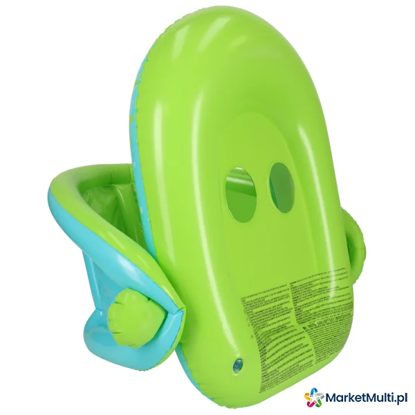 Zielone koło z siedziskiem to idealna propozycja dla malucha, który dopiero zaczyna naukę pływania. Dzięki otworom na nóżki, dziecko będzie stabilnie siedzieć w kółku i z niego nie wypadnie. Dmuchany daszek zapewnia ochronę delikatnej skóry dziecka od szkodliwych promieni słonecznych. Co więcej, idąc na basen, daszek można zdemontować. Koło jest wykonane z wytrzymałego PVC, dzięki czemu posłuży niejeden sezon letni.