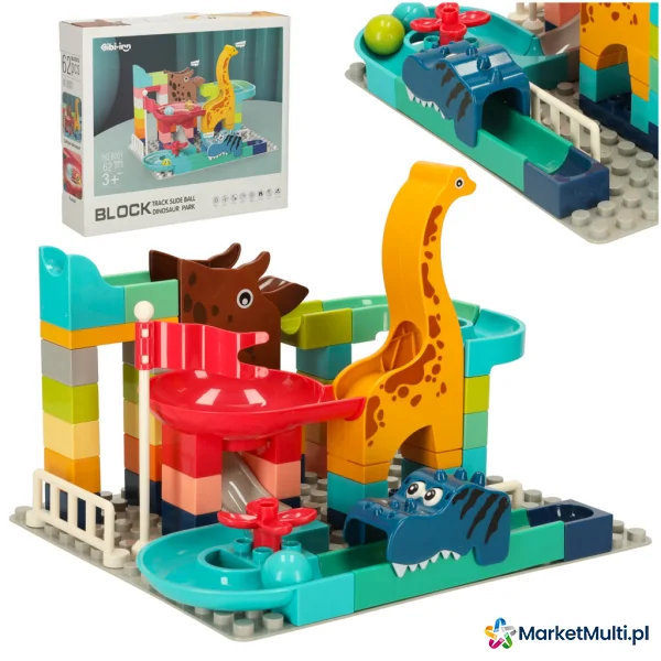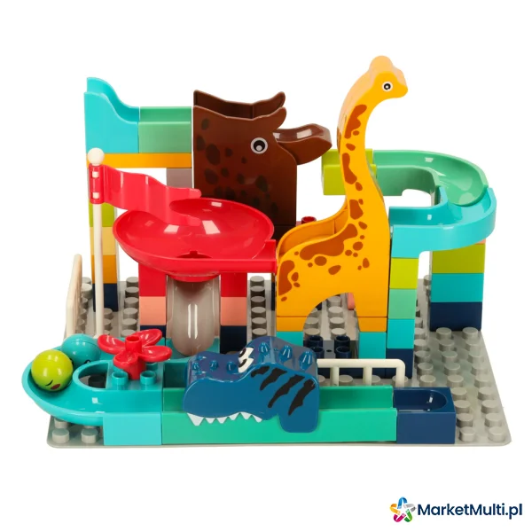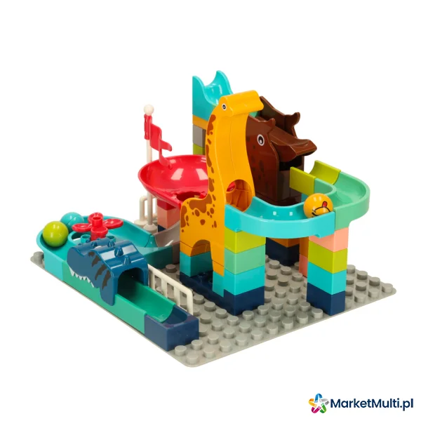 Zestaw składa się z 58 klocków, z których dziecko może zbudować własny tor kulkowy! Elementy można dowolnie łączyć, tworząc samodzielnie wymyślone trasy dla kulek, lub zaczerpnąć inspirację z pudełka i zbudować tor jak ze zdjęcia. Do zestawu dołączone są trzy kulki w różnych kolorach, które będą toczyć się po stworzonych torach.