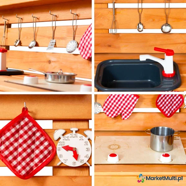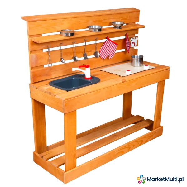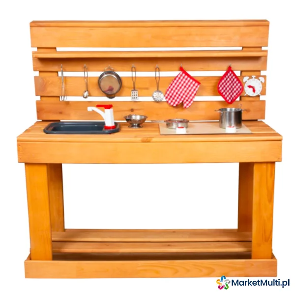 Kuchnia jest wykonana z gładko oszlifowanego i pokrytego impregnatem drewna, dzięki czemu bez obaw możesz zostawić ją na zewnątrz na całą wiosnę i lato. W zestawie liczne akcesoria do gotowania, które sprawią, że kuchenne przygody malucha będą bardziej realistyczne. Dodatkowo na blacie znajduje się zlew z kranem, a także kuchenka.