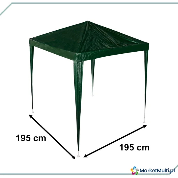 Duży pawilon ogrodowy w zielonym kolorze. Doskonale sprawdzi się podczas rodzinnych imprez w ogrodzie. Dzięki wymiarom 1,9x1,9 można postawić pod nim stół i krzesła. Zapewnia ochronę przed słońcem i małym deszczem. Stelaż jest wykonany z metalowych rurek, dzięki czemu cała konstrukcja jest stabilna. W zestawie są wszystkie niezbędne elementy montażowe.