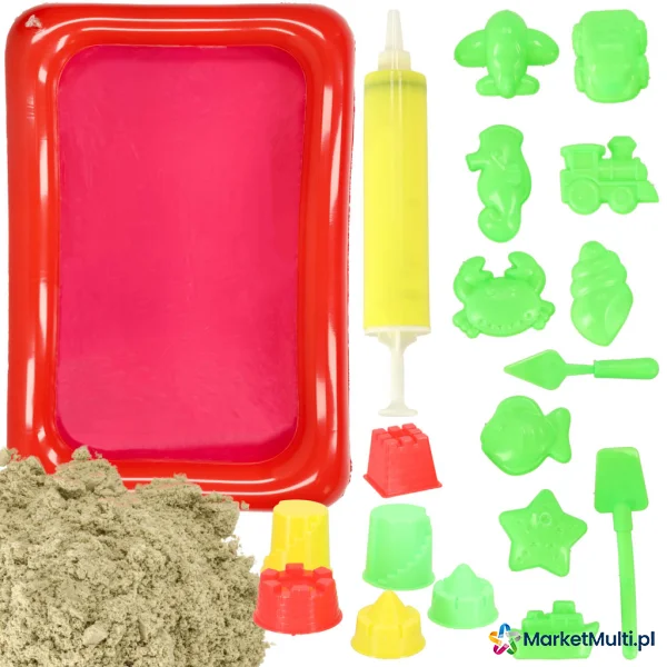 Zestaw zawiera również nadmuchiwana piaskownicę o wymiarach 56 x 40 cm, która jest świetnym dodatkiem do zabawy z piaskiem kinetycznym.