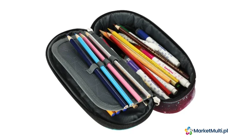 - dodatkowa klapka z miejscem na przybory piśmiennicze oraz kieszonką zapinaną na suwak