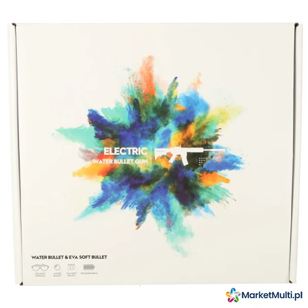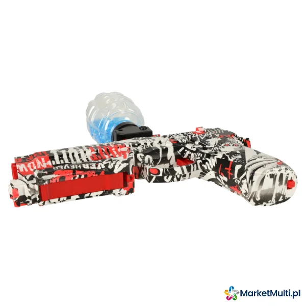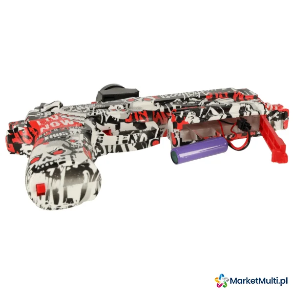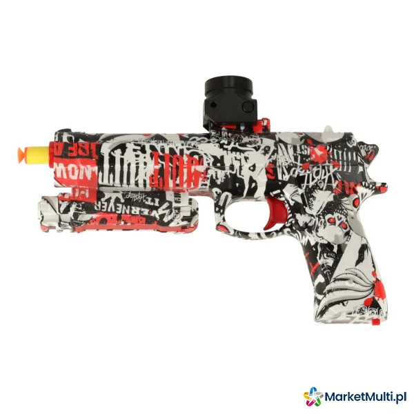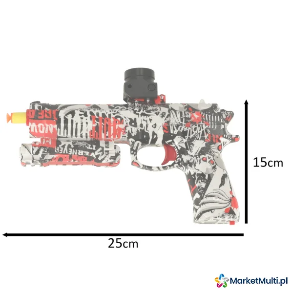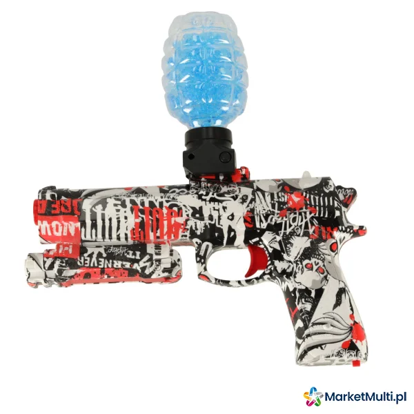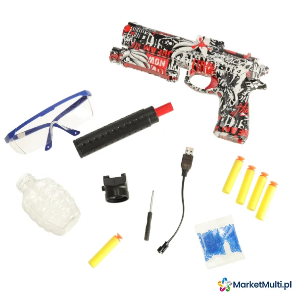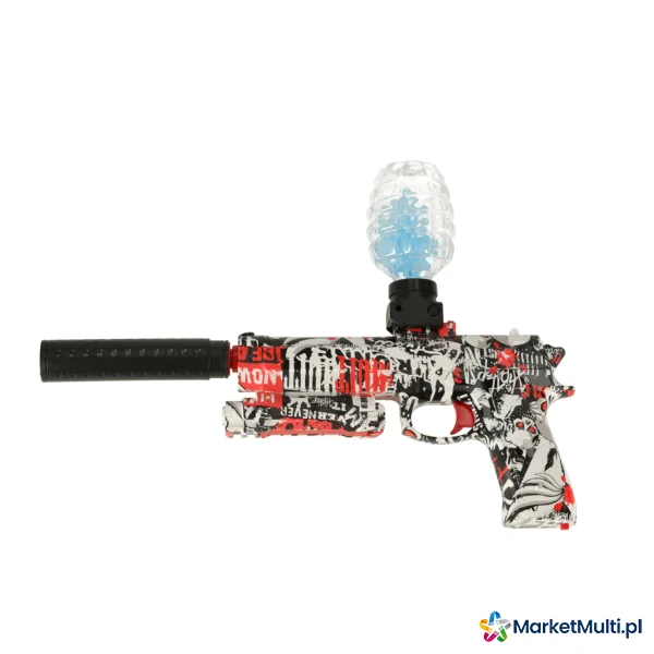 Elektryczny pistolet do zabawy. Strzela dwoma rodzajami amunicji – nabojami piankowymi oraz kulkami hydrożelowymi. W zestawie opakowanie kulek do samodzielnego przygotowania – kulki należy zanurzyć w wodzie na 3-4 godziny, aż zwiększą swoją objętość.