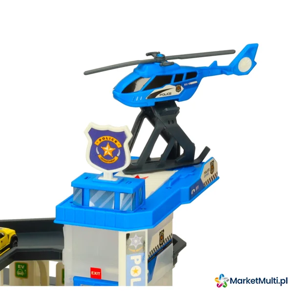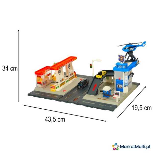 W skład zestawu wchodzi stacja benzynowa, parking policyjny oraz dwa pojazdy i helikopter, które umożliwiają tworzenie różnorodnych scenariuszy zabawy. Każdy element jest starannie zaprojektowany, aby oddać klimat prawdziwego miasteczka.