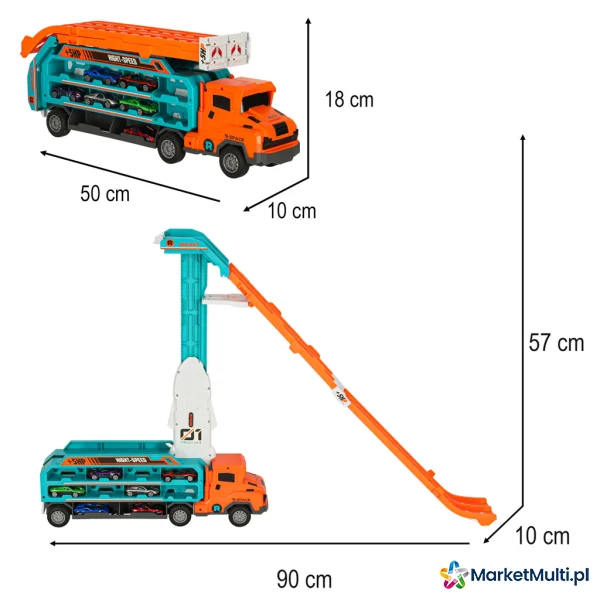 Wymiary ciężarówki: 50 cm x 10 cm x 18 cm