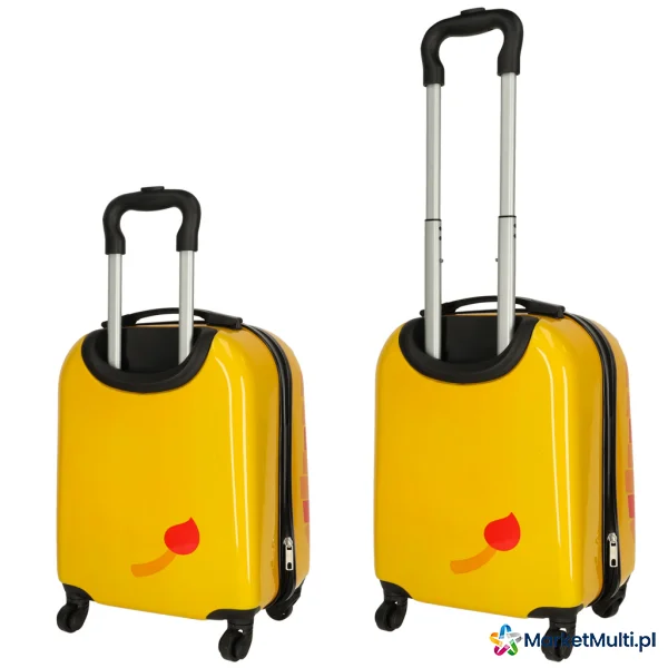 W walizce bez trudu zmieszczą się nie tylko ubrania na kilka dni, ale także ulubione zabawki dziecka, a to wszystko za sprawą dwóch komór – jednej w formie kieszonki, a drugiej z pasami zabezpieczającymi. Dziecko nie będzie miało problemów z prowadzeniem bagażu, ponieważ wyposażony jest w cztery kółka oraz teleskopowy uchwyt.
