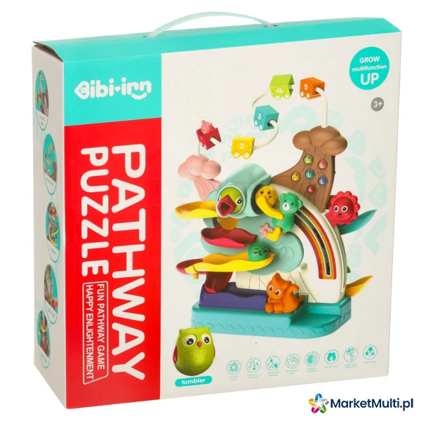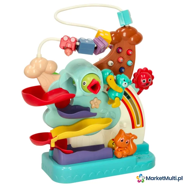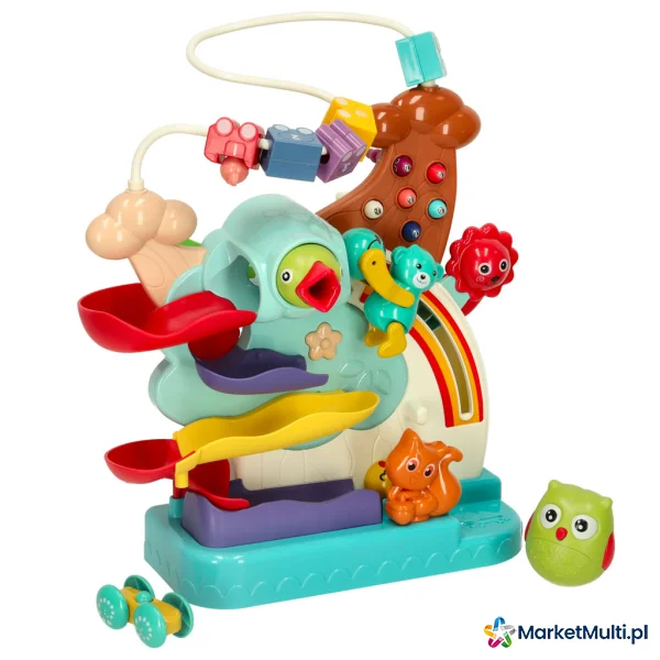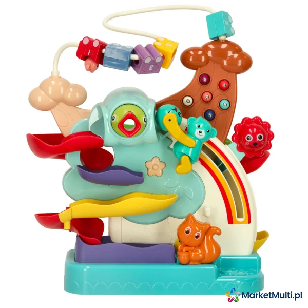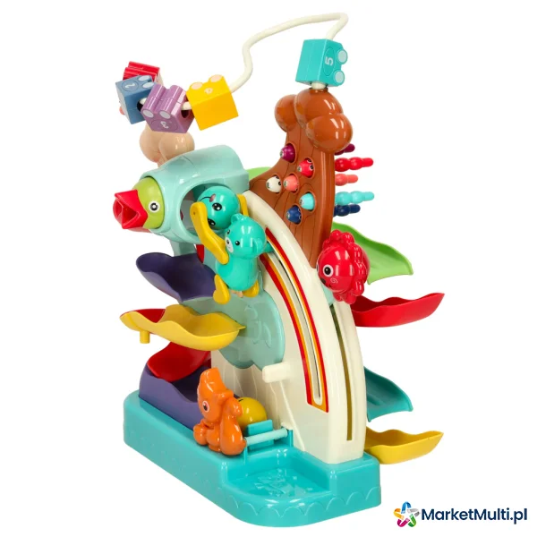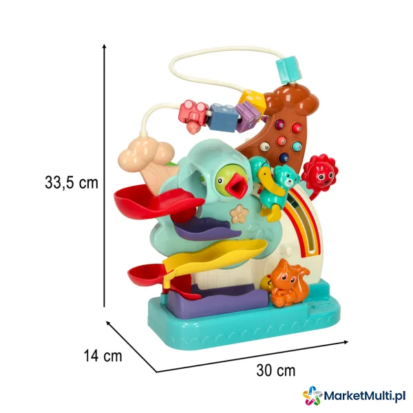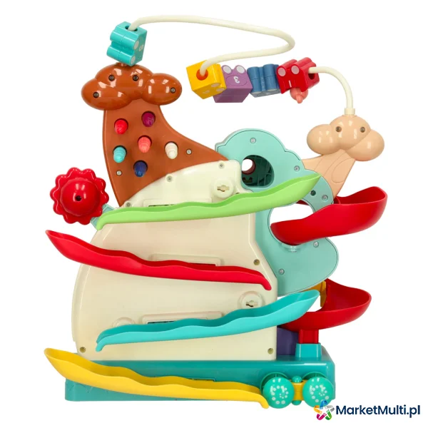 Zabawka posiada nie jeden, ale aż dwa tory, po których mogą toczyć się kolorowe kulki lub samochodzik. Dodatkową atrakcją są kolorowe wagoniki z cyframi, które dziecko może przesuwać i obracać. Ma również grę „nakarm ptaszka”, która polega na zebraniu robaczków i nakarmienie nimi ptaka.