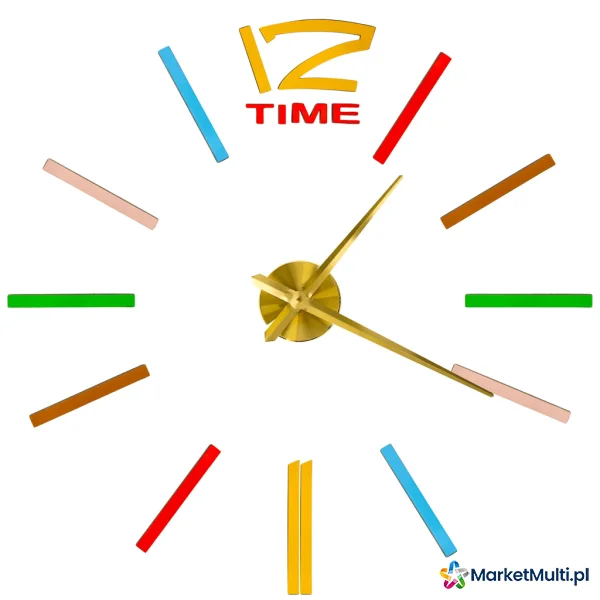 Znaczniki zegara są w różnych kolorach, a wskazówki są złote – dzięki czemu cały zestaw idealnie sprawdzi się jako kolorowy akcent dodający Twojemu wnętrzu niepowtarzalnego klimatu.