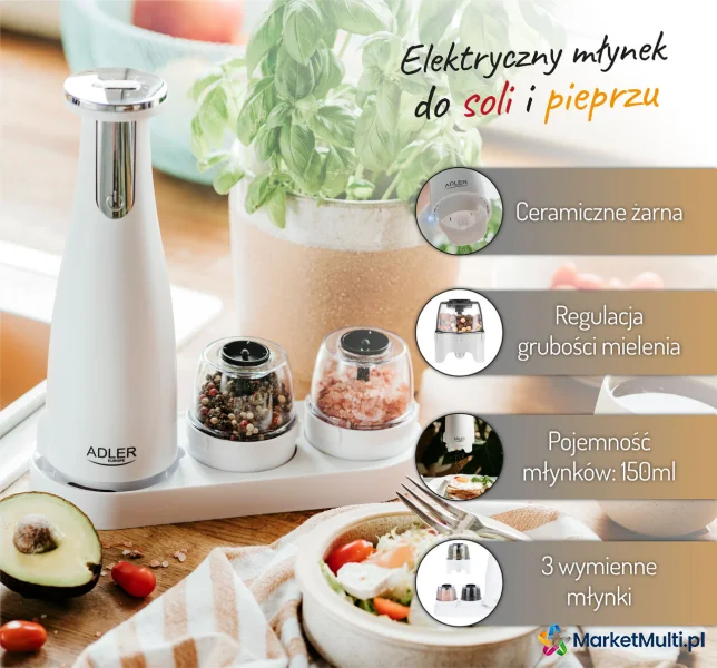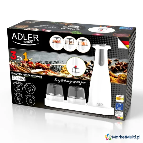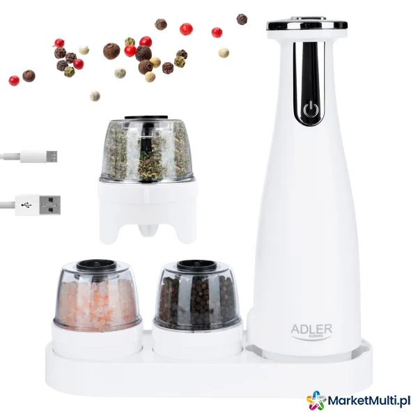 ADLER AD 4449W ZESTAW 3 MŁYNKÓW DO PRZYPRAW, SOLI I PIEPRZU - USB