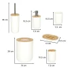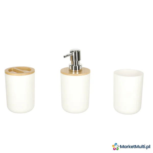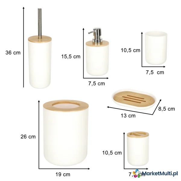 W skład zestawu wchodzą: dozownik do mydła, pojemnik na szczoteczki do zębów, mydelniczka, kubek, szczotka toaletowa z pojemnikiem oraz kosz na śmieci.