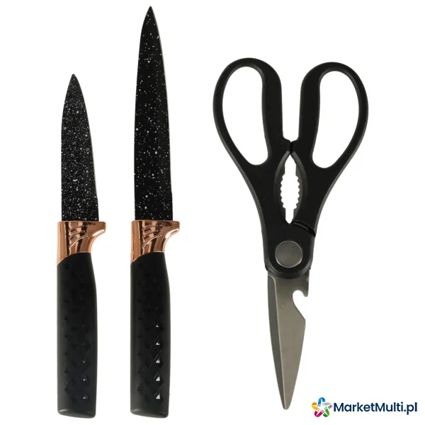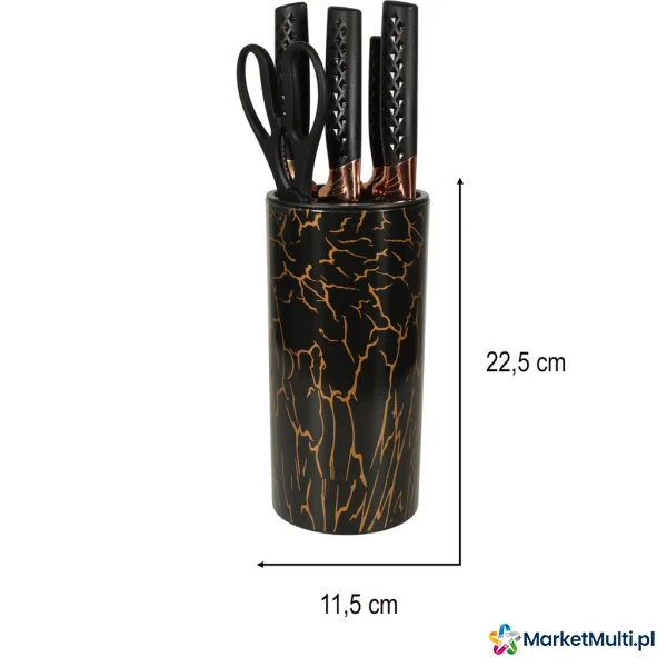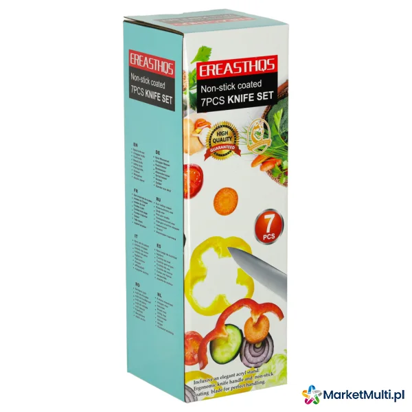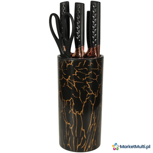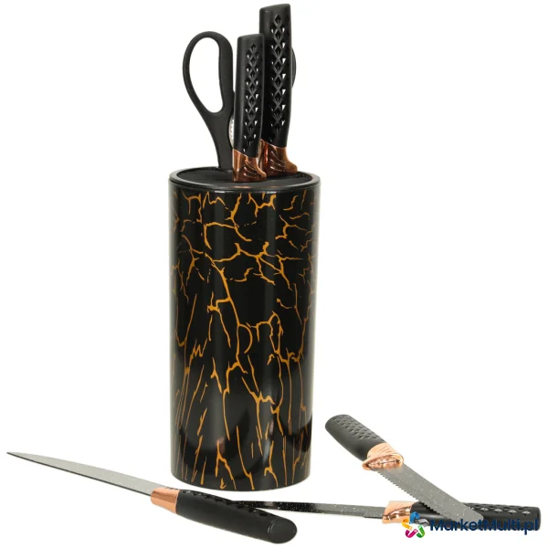 Tworzywo: ostrze: stal nierdzewna, uchwyty: plastik, stojak: akryl